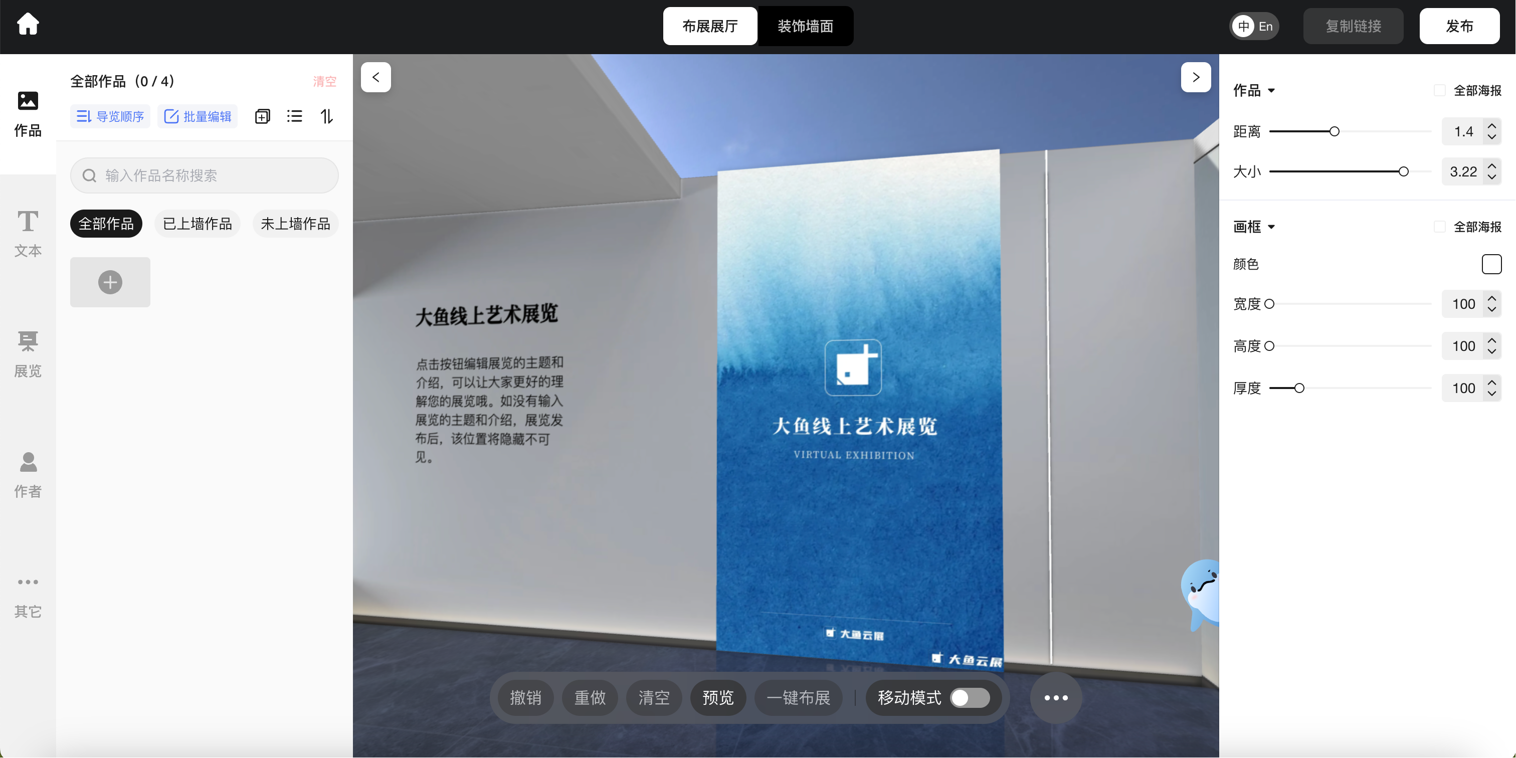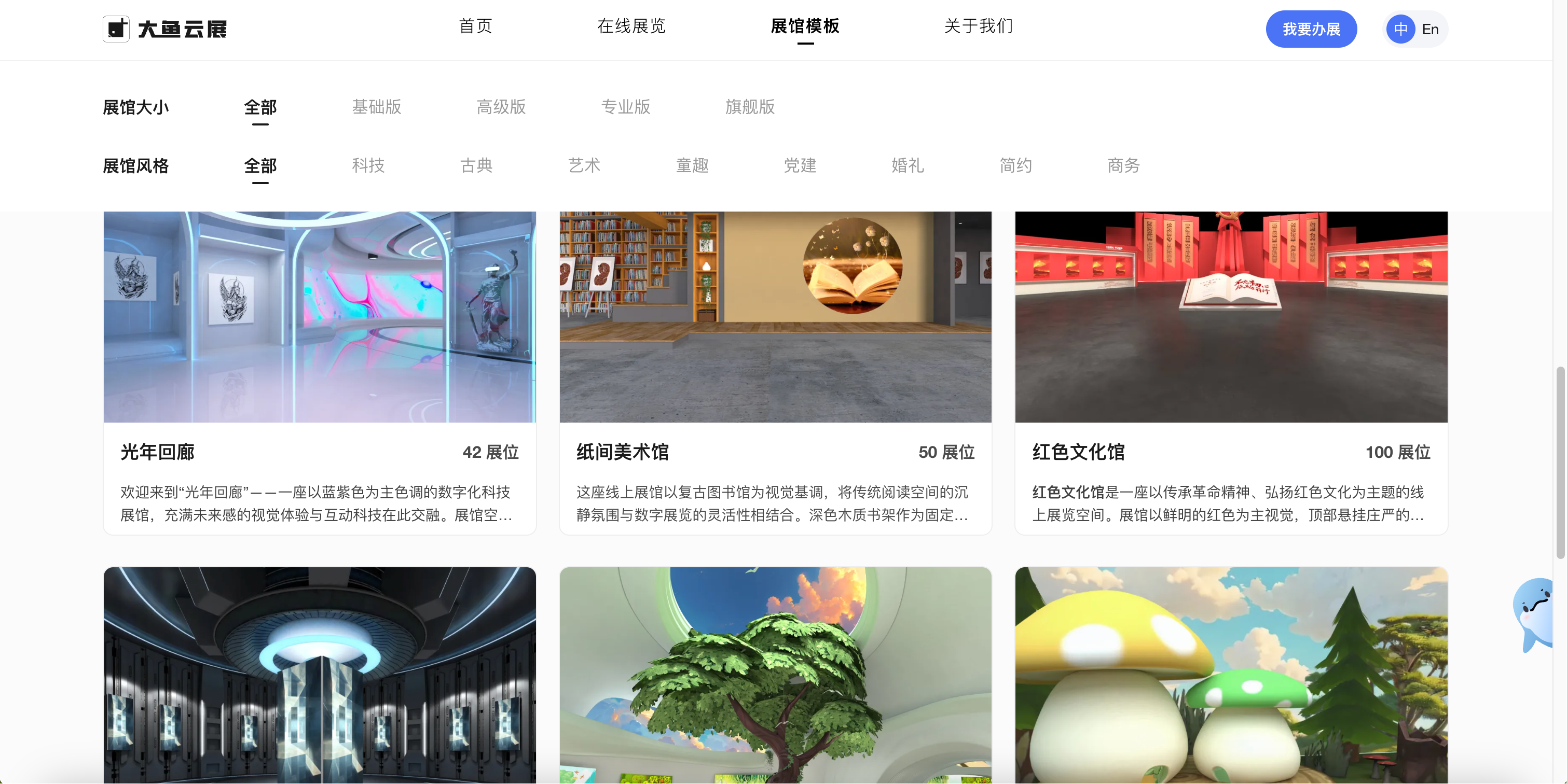 - 利用大鱼云展提供的多样化模板库,选择一个符合行业特性和展览主题的虚拟空间,通过可视化的操作,无需专业设计背景,即可搭建出专业级的展厅。